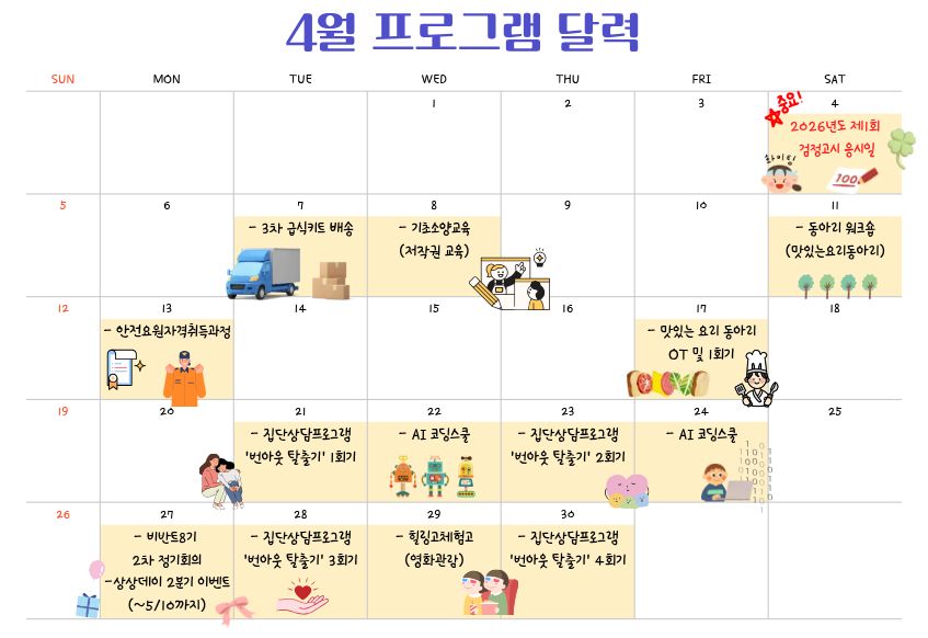[ºÏ±¸²Þµå¸² 4¿ù ÇÁ·Î±×·¥ ¾È³»]2026³â 4¿ù ÇÑ´Þ ÇÁ·Î±×·¥ ´Þ·ÂÀÔ´Ï´Ù~!4¿ù 4ÀÏÀº Á¦1ȸ °ËÁ¤°í½Ã ÀÀ½ÃÀÏÀÔ´Ï´Ù.ÀÀ½Ã¿¹Á¤ û¼Ò³âµéÀº Àß ÁغñÇÒ ¼ö ÀÖµµ·Ï ÇØÁÖ¼¼¿ä!¶ÇÇÑ ÇÁ·Î±×·¥ ÀÏÁ¤ÀÌ º¯°æ ¶Ç´Â Ãß°¡µÉ ¼ö ÀÖÀ¸´Ï ¿ÀÇÂäÆÃ¹æ È®ÀÎ ÀßÇØÁÖ¼¼¿ä~!